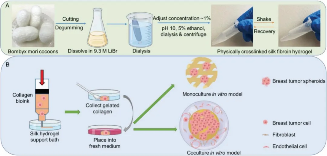 材料设计:使用了一种基于低浓度I型胶原的生物墨水,并与热响应的透明质酸(HA)基聚合物组合,称为胶原-HA-pNIPAM (CH) 生物墨水。该生物墨水被优化用于嵌入式3D生物打印,适用于乳腺癌细胞和癌症相关成纤维细胞(CAFs)。研究还使用生物相容且物理交联的丝蛋白水凝胶作为支撑浴,用于嵌入式3D打印,以支持低粘度胶原生物墨水的打印。