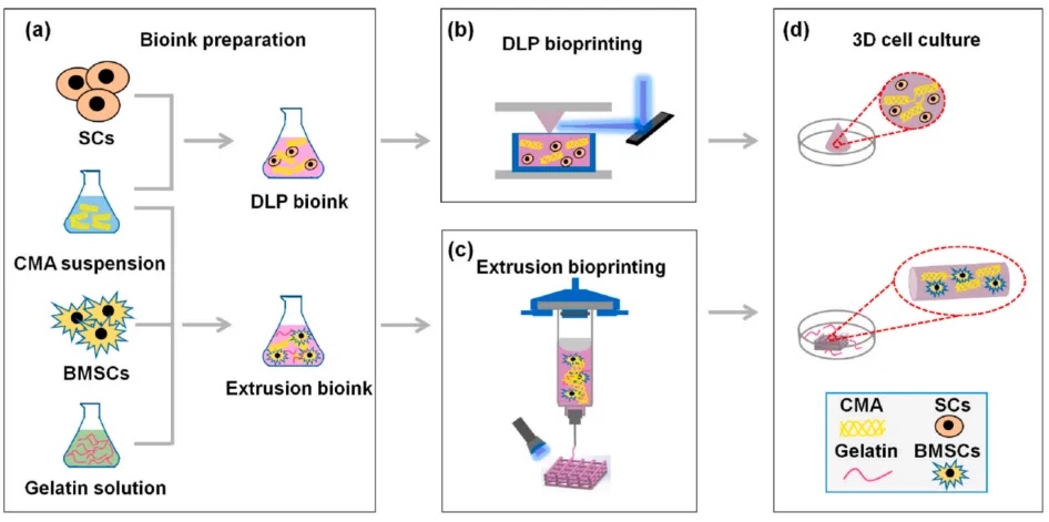 材料设计:本研究设计了一种改良的甲基丙烯酸化胶原(CMA)光固化生物墨水,利用来源于猪皮的I型胶原,通过在低温(4℃)和酸性条件(pH < 7.0)下进行甲基丙烯酸化处理,以提高其生物相容性和打印性能。CMA生物墨水具有良好的光固化特性,可与Schwann细胞(SCs)和骨髓间充质干细胞(BMSCs)相结合,适用于数字光处理(DLP)和挤出式生物打印。与传统的甲基丙烯酸化明胶(GelMA)相比,CMA保留了胶原特有的三螺旋分子结构,促进细胞与基质之间的信号传递和相互作用。