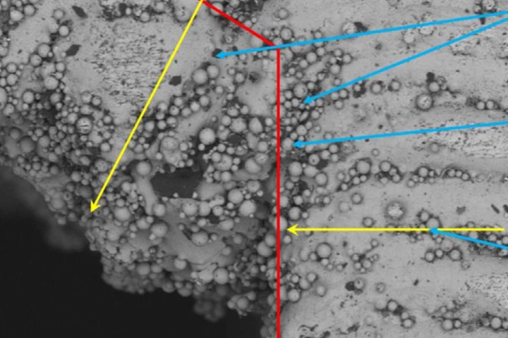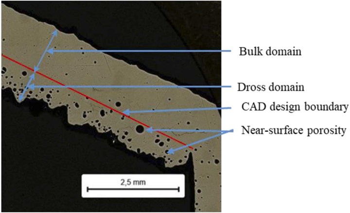 △显微照片显示零件朝下区域的熔渣,在这张显微照片中,红线标记了 CAD 设计的边界——其左侧的所有材料都是渣滓,即朝下表面上的多余材料。来源:AmalCharles、Mohamad Bayat 等人。
