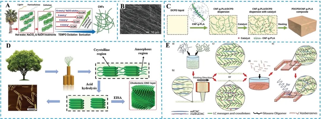 纳米纤维素(主要是CNFs和CNCs)独特的特性使其适合用于3D打印,从而能够创造出多种结构和材料。当前的研究重点是将纳米纤维素作为增强剂用于改善3D打印物品的尺寸稳定性,同时在组织工程、药物传递、可持续包装等领域也提出了新的应用可能性。