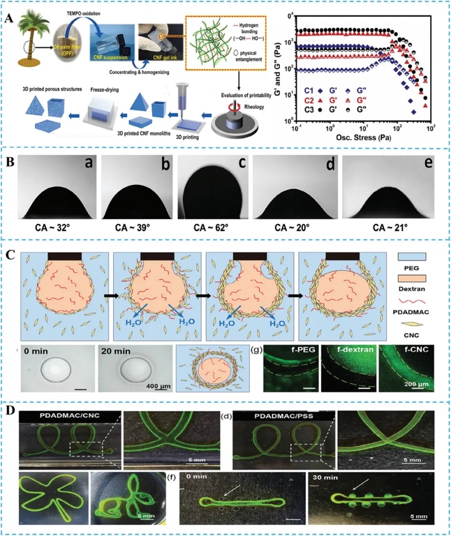 在3D打印中,墨水的流变特性至关重要。为了成功打印,墨水需具备高储能模量(G′)以保持结构完整性和尺寸稳定性,以及适度损耗模量(G″)以确保流动顺畅。纯CNF悬浮液由于其高G′,是理想的流变改性剂,可以补偿其他纤维素在高剪切下的剪切变稀现象。随着CNF浓度增加,G′和屈服应力线性增长,有助于保持形状。然而,过高的屈服应力和粘度可能增加打印压力,影响连续性,因此适当的粘度对制造复杂结构非常重要。打印墨水作为非牛顿流体,均表现出剪切稀化行为,便于在桶和喷嘴内流动。通过调整CNC与ENCC的比例,可以调节墨水的粘度和流动性,实现高保真度打印。此外,合适的接触角有助于墨水在打印床上的润湿,确保附着力和分辨率。最终,纳米纤维素能与聚电解质形成复合物,稳定水相两相系统,促进3D结构的构建(图2)。