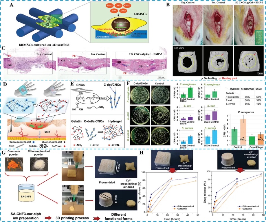 2、在生物医学领域的应用潜力:设计生物材料作为人工细胞外基质以模拟天然组织并重建复杂的三维微环境仍然面临挑战。CNFs和CNCs因其良好的生物相容性和机械性能,显示出广阔的生物医学应用潜力。研究表明,高比例CNCs与聚乙烯醇(PVA)结合,可制备适合人工血管的墨水,显著提升拉伸模量并具有与天然动脉相似的稳定性。此外,CNCs改善超声成像效果。通过3D打印,开发的生物可降解水凝胶能促进细胞增殖和骨组织再生。CNFs不仅增强细胞附着和机械强度,还可用于导电神经支架,促进神经细胞生长。同时,CNCs与其他材料结合具有抗菌特性,帮助对抗抗生素耐药菌。这些进展表明,纳米纤维素在3D打印生物材料中的应用能够有效构建与天然组织相似的细胞外基质,促进组织再生和修复,并在先进医疗设备和个性化药物递送系统方面展现广阔前景(图4)。