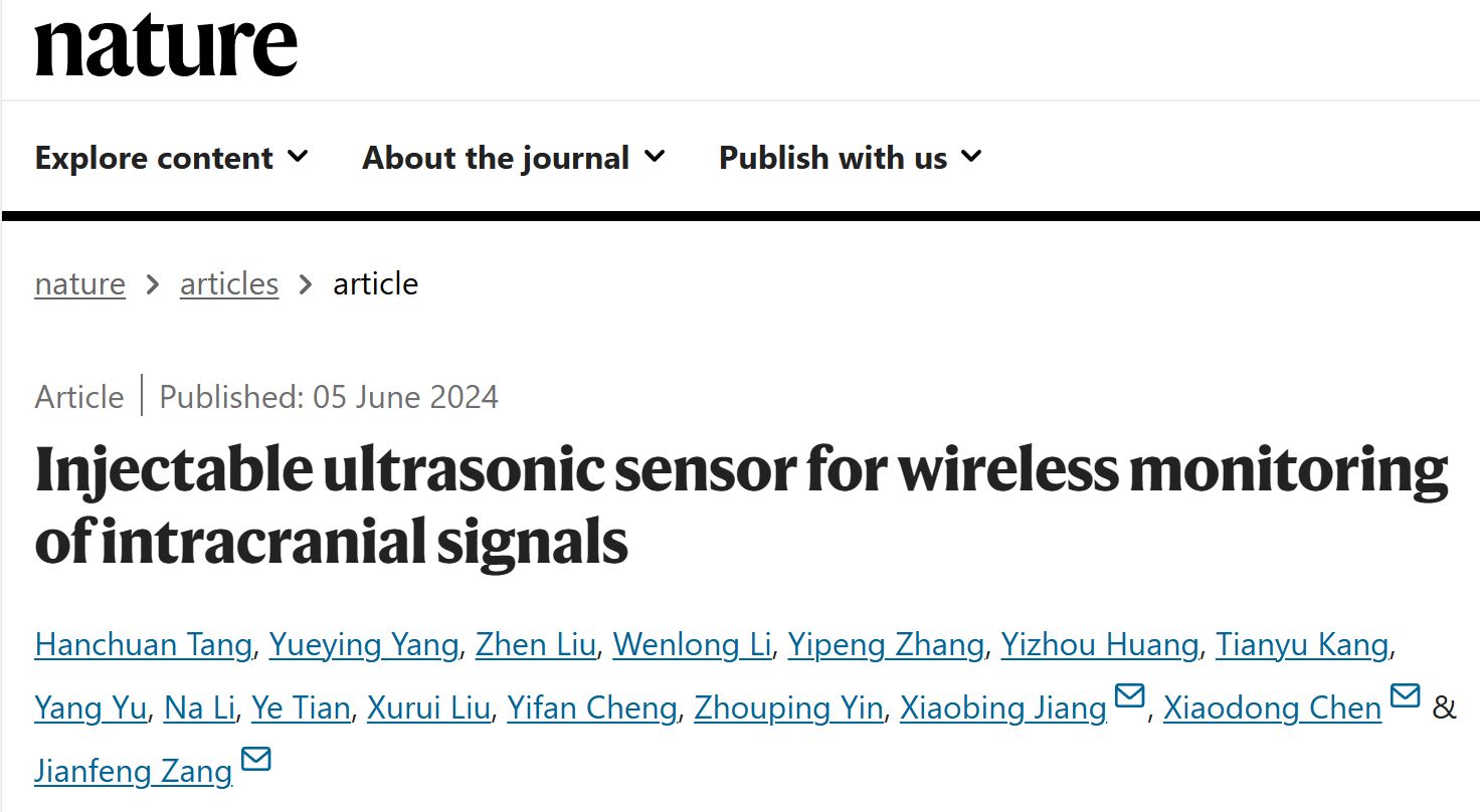 2024年6月5日,华中科技大学臧剑锋教授、姜晓兵教授以及新加坡南洋理工大学陈晓东教授团队携手合作,研发出一种创新型可注射超声凝胶传感器,有望克服传统有线传感器存在的感染风险和术后并发症等问题,同时避免现有无线电子传感器体积过大、无法体内降解等临床应用挑战。相关研究成果以Injectable ultrasonic sensor for wireless monitoring of intracranial signals为题在线发表于Nature期刊。