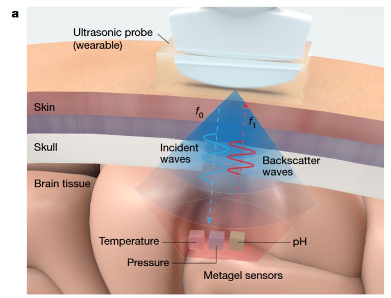 △可注射、可降解的超凝胶超声传感器设计原理--基于超声反射的超凝胶无线颅内生理传感器示意图。