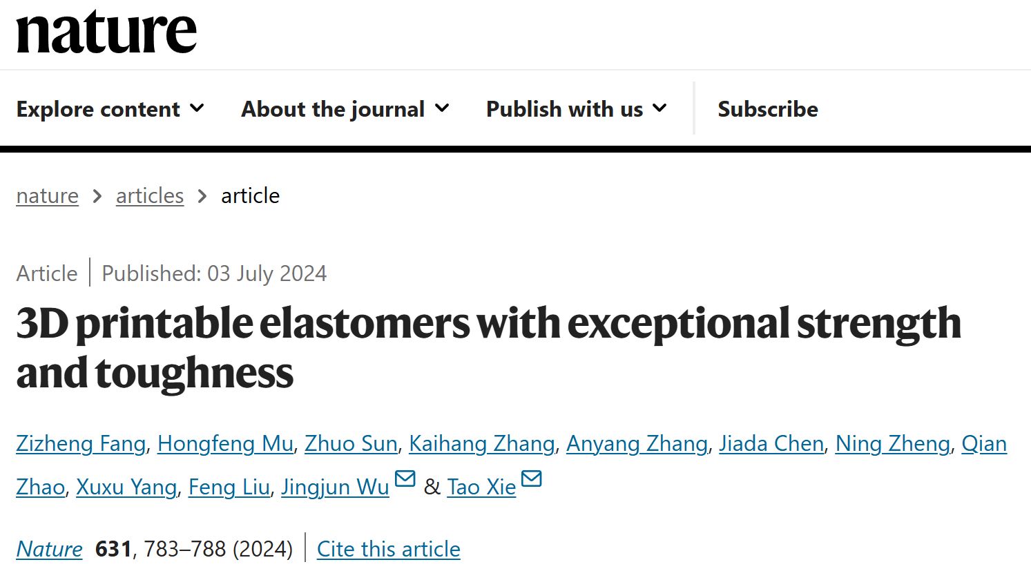 2024年7月,浙江大学化学工程与生物工程学院谢涛、吴晶军研究团队最近3D打印出一根“超级橡皮筋”,它能拉伸到自身长度的9倍以上,直径约1毫米的“身躯”能提起一包10公斤的大米,其性能远超其他3D光固化打印弹性体。他们的研究成果已经发表在Nature上,题目为3D printable elastomers with exceptional strength and toughness。