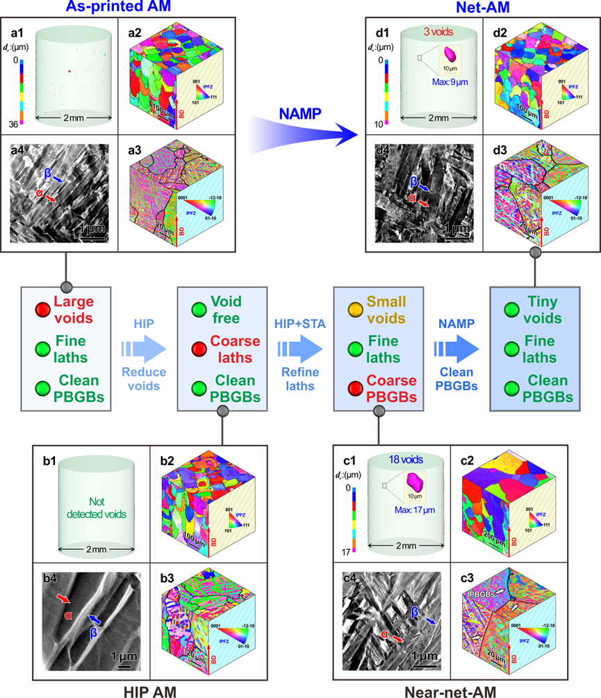 幸运的是,研究人员在Ti-6Al-4V合金中首次发现,高温下3D打印态组织的晶界迁移及气孔长大与相转变过程表现出异步的特性,即存在一个热处理工艺窗口,既可实现板条组织细化,又能有效抑制晶界α相富集及气孔复现。为此,研究人员巧妙地利用了这一工艺窗口,发明了缺陷与组织分步调控的NAMP新工艺(Net-Additive Manufacturing Process),最终制备出几乎无气孔的近Net-AM Ti-6Al-4V合金。NAMP工艺步骤主要包括用于消除微孔的热等静压 (HIP) 以及随后用于恢复增材制造微观结构的高温短时 (HTSt) 热处理具有细小的马氏体板条,可以成功地使钛合金恢复几乎无空隙的Net-AM显微组织。