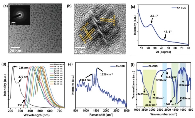 (1)这些支架有二维和三维形式,并具有来源于壳聚糖基碳量子点(Ch-CQDs)的纳米/微米特征。Ch-CQDs作为TPL的双光子引发剂,并为支架提供足够的机械强度和特定的结合位点。