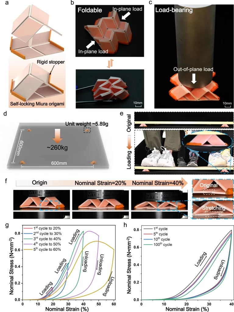 2025年1月10日,深圳南方科技大学和香港城市大学的研究人员利用多材料3D打印技术成功创建了完全由柔软、可拉伸铰链包裹的刚性面板结构。这种独特的设计使得每个折纸单元能够承受超过自身重量11万倍的重量,并且能够承受超过100次的40%压缩应变循环,同时还能吸收相当大的冲击能量。这一策略有望实现前所未有的承重能力和灵活性。