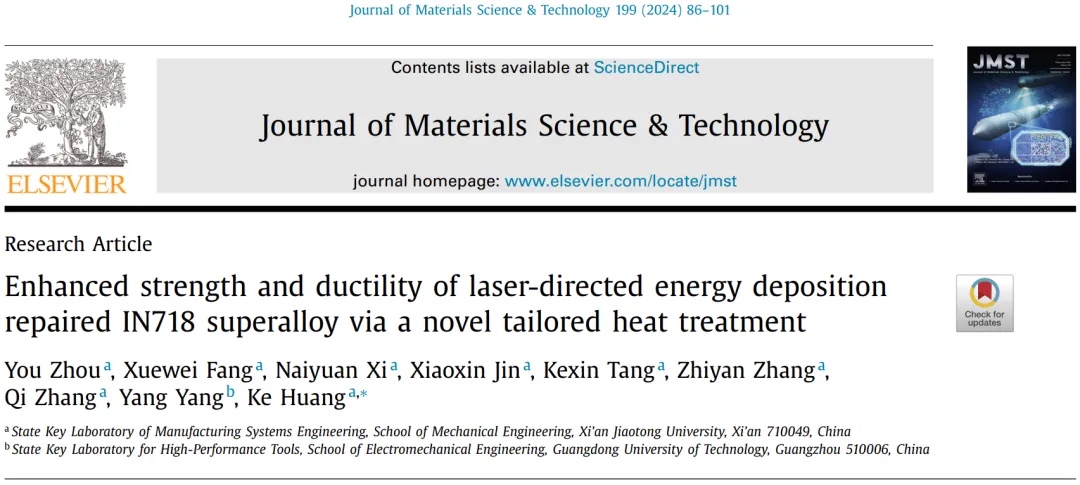 You Zhou, Xuewei Fang, Naiyuan Xi, Xiaoxin Jin, Kexin Tang, Zhiyan Zhang, Qi Zhang, Yang Yang, Ke Huang, Enhanced strength and ductility of laser-directed energy deposition repaired IN718 superalloy via a novel tailored heat treatment, J. Mater. Sci. Technol. 199 (2024) 86-101.