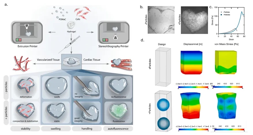 研究人员在各种水凝胶中嵌入POMaC颗粒(特别是纤维蛋白、GelMA和海藻酸盐)创造了多功能的颗粒生物墨水,这些墨水支持基质细胞、成纤维细胞和人类诱导多能干细胞衍生的心肌细胞的重塑和组织生成,并增强血管形成,同时添加荧光以用于构建标记(图1a和b)。微机械压缩测试结果表明,复合材料在大范围应变下表现出与其母本水凝胶相似的行为(图1b),这有助于挤出式3D打印。剪切压缩测试显示,在低应变下,变形主要通过水凝胶组分传递,复合颗粒生物墨水表现出与其母本水凝胶几乎相同的机械性能(图1c)。然而,随着压缩剪切应变增加,变形通过水凝胶传递,使弹性颗粒相互接触,从而抵抗施加的变形(图1c)。因此,复合生物墨水在较高应变下表现得像弹性固体,最终表现出比其母本水凝胶显著更高的极限抗拉强度(图1c)。有限元建模表明,当结构受到相同的压缩位移时,与仅有的水凝胶相比,复合材料内的von Mises应力降低(图1d),进一步支持了复合材料抵抗压缩的能力。这些双模态机械性能使得颗粒复合材料在细胞培养和植入中表现出独特的行为。