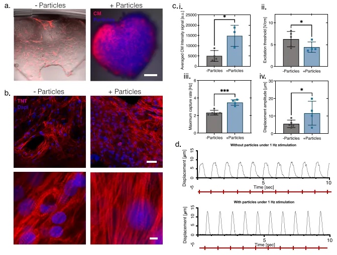 本文将人类诱导多能干细胞(iPSC)衍生的心肌细胞(CMs)接种到POMaC/GelMA 3D打印的结构上,并监测它们的发展。这些细胞培养了10天,在此期间它们被允许扩展并表现出收缩活动(图5a)。肌钙蛋白-T(TnT)染色表明心脏组织形成更加健壮,这通过图像分析工具进一步量化(图5b和ci)。心脏功能也得到了评估,结果显示含有颗粒的结构有所改善,表现为较低的兴奋阈值(图5cii)和增加的最大捕获率(图5ciii)。此外,在1Hz刺激下,含POMaC颗粒的结构位移幅度更大(图5civ和d)