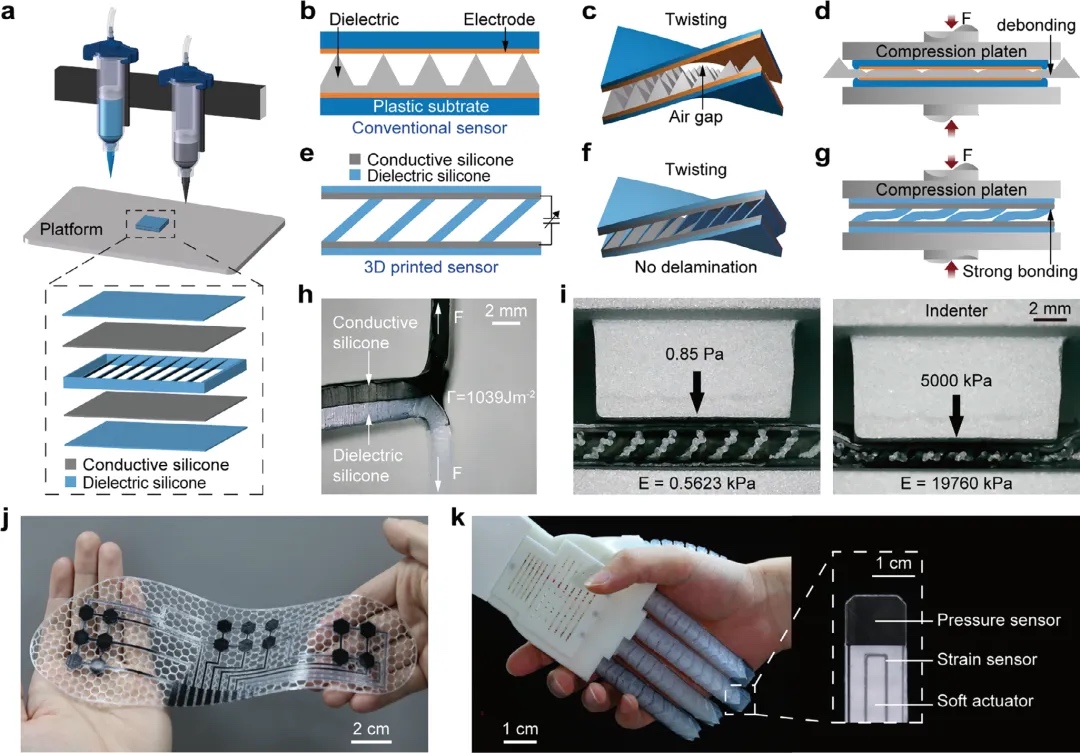 该研究开发了一种定制的3D打印技术,用于制造软电容传感器,并通过优化材料和结构设计提升其性能(图1a)。该传感器采用了创新的设计:介电硅胶被倾斜排列形成薄板结构,夹在两层平面导电硅胶之间(图1b–d)。与传统软传感器常见的分层和脱粘问题不同,这种新型传感器能够有效避免这些缺陷,其导电和介电硅胶材料具有相似的刚度,从而增强了传感器的可靠性。在3D打印过程中,导电和介电硅胶墨水保持未固化状态,有助于在电极和介电层之间形成强大的分子网络和化学键,使得传感器即使在扭曲或受压时,也能抵抗分层和脱粘(图1f-g)。