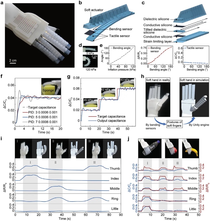 最后,作者开发了一种完全3D打印的软体机器人手,通过软气动驱动器和软传感器实现精确控制(图5a)。每根手指包含软气动执行器、电容触觉传感器和电阻弯曲传感器,采用介电和导电硅胶材料,在一步打印过程中完成,无需后处理。优化的打印参数确保了手指的结构一致性,并避免了导电与介电材料的相互干扰(图5b-d)。触觉传感器独立于弯曲传感器工作,可测量指尖的接触力,而弯曲传感器检测手指的弯曲(图5e)。结合触觉传感器,软体机器人手可以实现实时闭环反馈控制,精确控制抓取力(图5f-g)。此外,软弯曲传感器还可用于在虚拟现实中模拟手指的动作,提供精准的手势模拟,广泛应用于医疗训练、元宇宙及人机交互中(图5h-i)。
