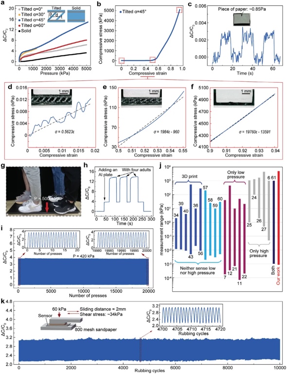 薄板介电层的存在使得传感器具有较低的压缩模量,并且在较大应变下,模量显著增大,能够承受更大的压力(图3d-f)。该结构提供了在小应变范围内高灵敏度,在大应变范围内较大测量范围的优势。进一步实验验证了传感器在高压下的稳定性。图3g-h显示,传感器能够在5000 kPa的压力下稳定工作,并在周期性压力下表现出稳定响应。此外,传感器具有高分辨率,能够检测到小幅度的压力变化,且在20,000次循环测试中没有明显的信号变化(图3i)。与其他软电容传感器相比,本文传感器的检测范围更广,能够覆盖从0.85 Pa到5000 kPa的压力范围(图3j)。