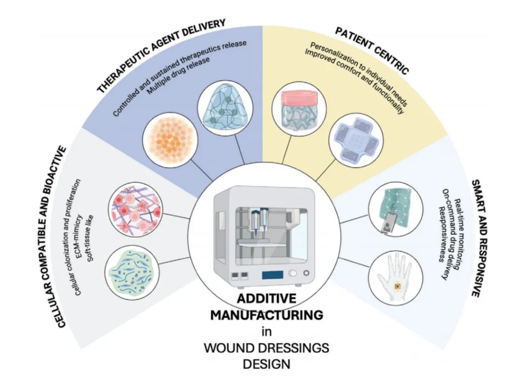 伤口是由于机械、化学、热损伤或潜在的医疗或生理状况造成的皮肤缺损或破坏。伤口护理对全球卫生系统构成挑战,因为传统的敷料很难解决伤口愈合的多样化和复杂性。鉴于传统治疗的局限性如需要经常更换、容易脱落、难以维持伤口的湿润环境等,寻求一种创新的替代方案已迫在眉睫。近几年,随着增材制造(AM)工艺的不断优化和性能的不断提升,AM已成为开发高级伤口敷料的一种独特且具有变革性的策略,能够提供前所未有的功能和定制功能。