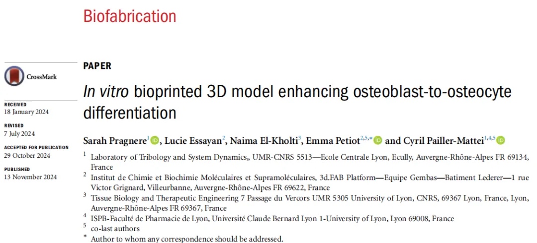 针对此问题,来自法国里昂的分子和超分子化学与生物化学研究所Emma Petiot开发了一种通过生物3D打印技术开发的体外骨模型,该模型能够促进初级人成骨细胞向骨细胞的分化过程。相关研究以“In vitro bioprinted 3D model enhancing osteoblast-to-osteocyte differentiation”为题发表在《Biofabrication》上。
