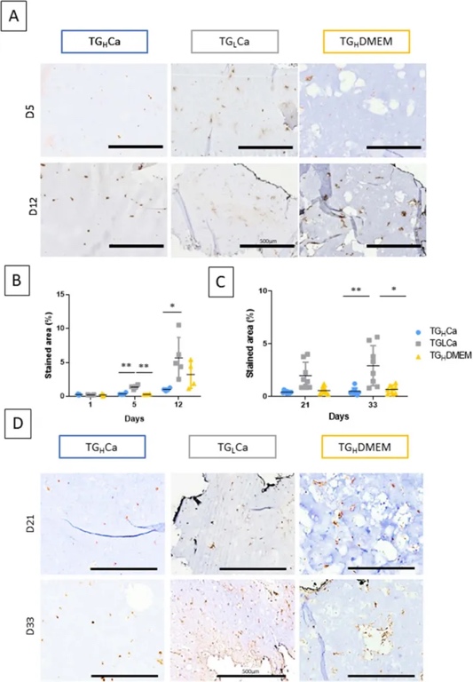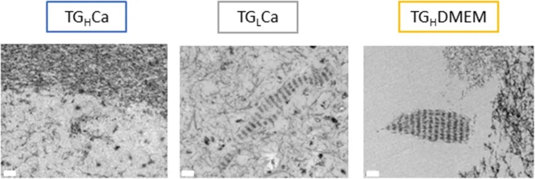 研究者通过生物3D打印技术构建了包含成骨细胞的水凝胶模型,并分析了细胞如何通过分泌细胞外基质蛋白影响其微环境,从而促进骨细胞分化。具体来说,研究者观察到了成骨细胞在水凝胶中分泌的纤维连接蛋白和胶原蛋白I,这些蛋白是细胞外基质的重要组成部分。通过免疫组织化学染色和透射电子显微镜(TEM)分析,研究者发现,在TGLCa条件的水凝胶中,成骨细胞分泌的胶原蛋白I显著增多,且水凝胶的收缩现象明显,这表明细胞-基质相互作用在骨细胞分化中起着关键作用。此外,研究还发现细胞通过改变水凝胶的微结构来适应其分化需求,例如在高微孔性的水凝胶中,细胞能够更好地扩散氧气和营养物质,从而促进骨细胞的成熟和分化。