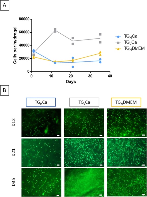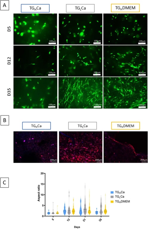研究者通过调整水凝胶的弹性模量和粘弹性行为,探讨了这些力学性质如何影响成骨细胞向骨细胞的分化过程。具体而言,研究者制备了三种不同力学性质的水凝胶:TGHCa(高弹性模量和粘弹性行为)、TGLCa(低弹性模量和粘弹性行为)和TGHDMEM(低弹性模量但弹性行为)。通过动态力学分析(DMA)表征水凝胶的力学性质,并使用透射电子显微镜(TEM)分析水凝胶的微孔性。结果表明,TGLCa条件的水凝胶(弹性模量为8 kPa且具有粘弹性行为)最能促进成骨细胞的分化,表现为细胞增殖停止、碱性磷酸酶活性增加、树突发展和骨细胞标志物PHEX的表达。这一发现强调了水凝胶的粘弹性行为和适当的弹性模量在调控成骨细胞分化中的关键作用。此外,研究还发现高微孔性的水凝胶能够改善氧气和营养物质的扩散,进一步促进成骨细胞向骨细胞的分化。
