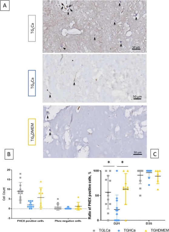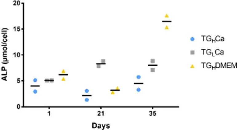 研究者通过在优化后的水凝胶中培养成骨细胞,观察到了骨细胞特异性蛋白PHEX的表达,这是骨细胞成熟的重要标志。通过免疫组织化学染色,研究者发现,在TGLCa条件的水凝胶中,成骨细胞在培养21天后开始表达PHEX,且随着时间的推移,表达量逐渐增加。此外,研究者还通过碱性磷酸酶(ALP)活性的检测进一步验证了骨细胞的分化过程。ALP是成骨细胞分化的早期标志物,其活性在成骨细胞向骨细胞分化过程中逐渐降低。研究结果表明,在TGLCa条件的水凝胶中,ALP活性在初期增加,随后稳定,这与骨细胞分化的典型过程一致。