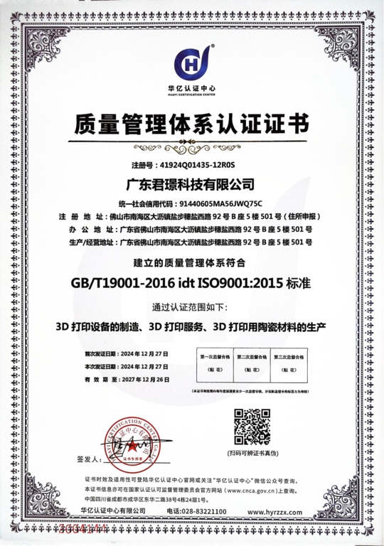 专注光固化3D打印陶瓷/金属,君璟科技先后获得ISO认证和高新技术企业