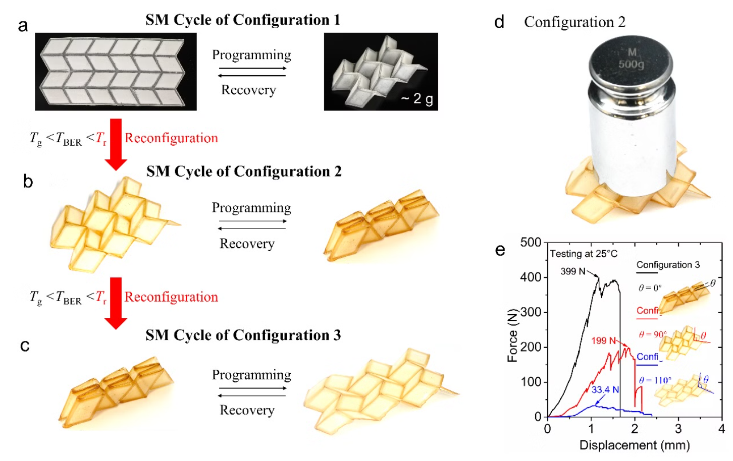 MRC-SMP 的显著变形能力使一张打印折纸能够快速重新配置成多个 SMP 折纸(图 2a-c)。MRC-SMP的高玻璃化转变温度确保 3D 折纸结构在室温下具有高刚度,并能支撑重载(图 2d-e)。