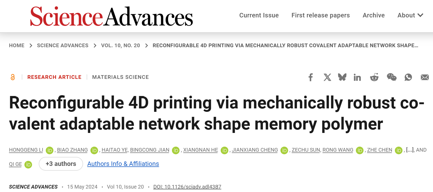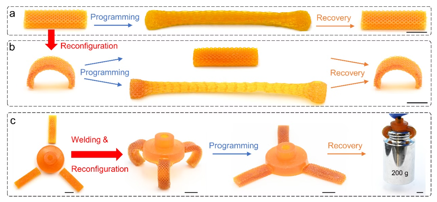 相关成果以题为“Reconfigurable 4D printing viamechanically robust covalent adaptable network shape memory polymer/通过机械稳健协同自适应网络形状记忆聚合物实现可重构4D打印”已发表在《科学进展》上。