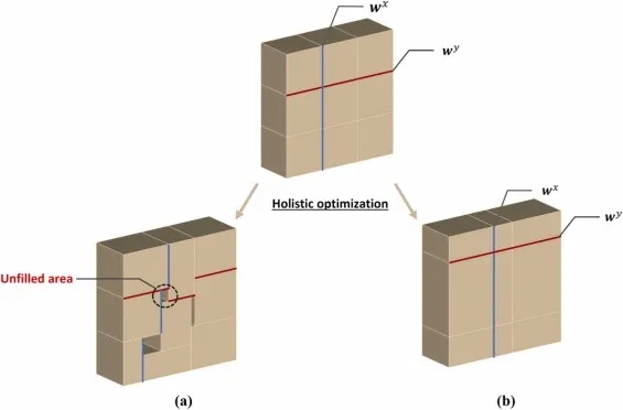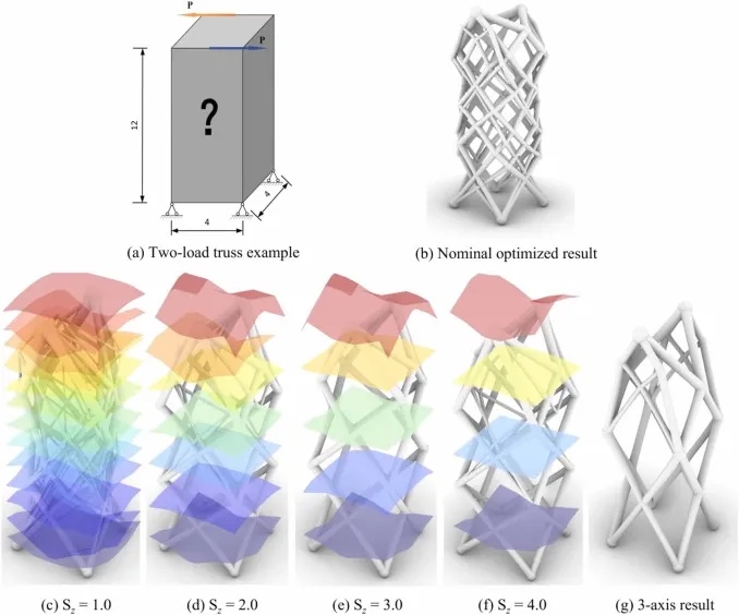 近日,叶俊团队、英国利兹大学、墨尔本皇家理工大学、谢菲尔德大学、帝国理工学院和巴斯大学在工程技术领域顶刊Engineering Structures上发表了题为"Concurrent optimization of truss structures and build directions for multi-axis additive manufacturing"的成果。本文介绍了一种考虑带有悬垂约束的桁架布局优化的方法。具体而言,基于多轴增材制造来考虑悬垂约束,在优化过程中同时设计结构和相关的局部构建方向。提出了一种两步优化方案。第一步采用一种新颖的优化问题,专注于确定给定优化结构的打印表面。然而,由于在这一步结构保持不变,悬垂问题可能无法消除。为了解决这个问题,第二步采用综合优化,同时细化结构和打印表面。这旨在进一步提高结构效率,同时最大程度地减少悬垂。鉴于这个综合问题的非线性和非凸性,还引入了一种迭代方法来提高第二步初始解的质量。通过几个数值示例验证了所提方法的有效性。此外,使用多轴增材制造机器对其中一个优化结构进行了物理验证。