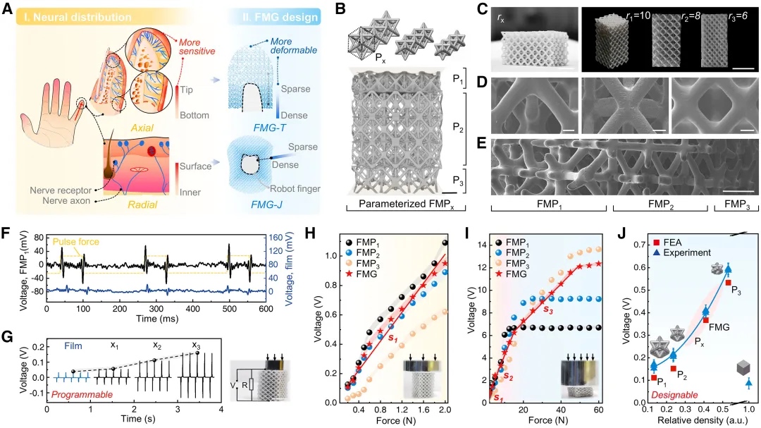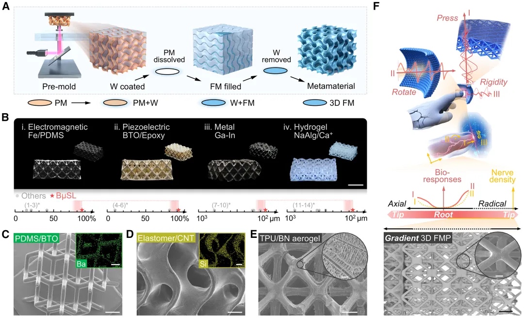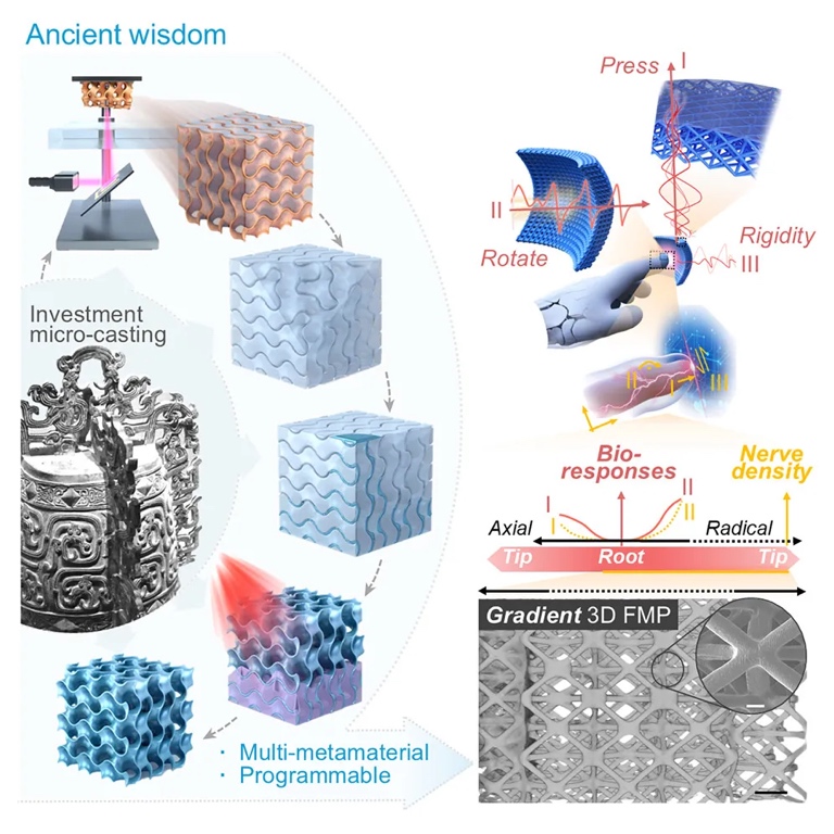 基于此,来自西安交通大学的陈小明、邵金友教授团队在《Device》上发表一篇题为“ Investment micro-casting 3D-printed multi-metamaterial for programmable multimodal biomimetic electronics”的论文。