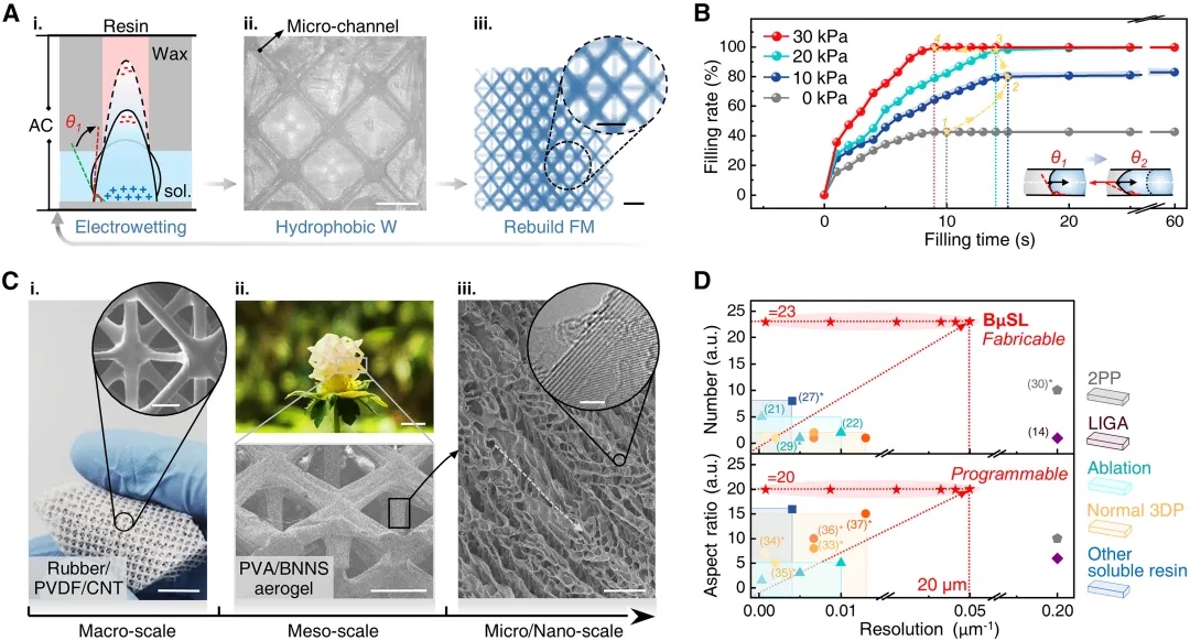 作者进一步对超疏水可稳定去除的“模骨”制造进行了研究(图3)。实现“蜡模”与“模骨”的结构转化是BμSL方法中的难点。作者提出基于电润湿效应的微流道异质材料置换方法,得到了跨尺度、多种类(PVDF/CNT,PVA/BNNS)的压电超材料,包括具有微观三维结构的橡胶基超材料和具有微-纳二级结构的气凝胶超材料。与同类型制造方法对比,BμSL在成形结构长径比(>20)、材料选择种类(>20)和成型尺寸(50μm)等方面,均优于其它方法。