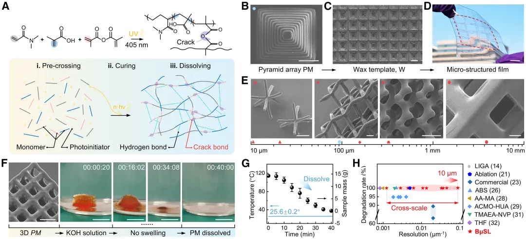 首先,作者研究了BμSL方法中的关键工艺步骤(图2):可溶性光敏树脂的合成及微尺度结构打印。通过研究并调控树脂组成及曝光成型规律,实现常温常压下无明显溶胀的光固化“蜡模”制造,最小成形尺寸可达10 μm。与LIGA刻蚀及其他可溶可打印的高分子体系对比,该树脂体系可裂解成盐并溶于水,无固体残余,在裂解率和最小成型尺寸上具有明显的优势。其中,该研究利用摩方精密nanoArch® P140(精度:10 μm)3D打印系统制备了一种具有复杂结构的可溶光敏树脂3D打印预模(PM)。