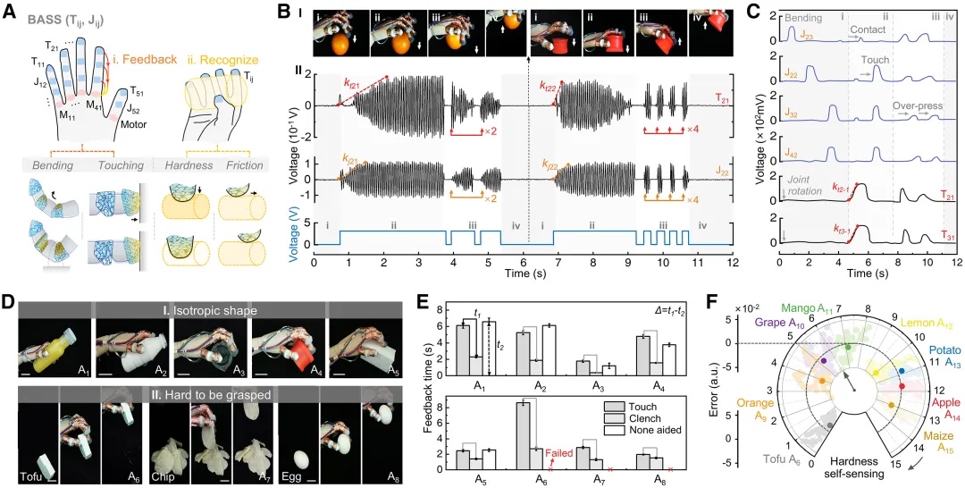 作者建立了压电超材料器件与机械手自主控制的交互系统(图5)。通过将多个FMG-T/J器件分别安装到机械手的尖端和关节处,测试并获取仿生多模态阵列感知系统(BASS)对软硬感知的斜率特征(kx)和抓取状态(U(θ))的响应特征。研究发现,该系统增强了机械手对易碎、易变形等15种物体的感知能力。作者通过将感知数据结合强化学习模型训练,显著提高了硬度识别精度。BASS赋予机械手对不同软硬物体(0.72-13.15 kg/cm2)的动态抓取反馈和多模态(接触、弯曲、摩擦、刚度)感知能力。