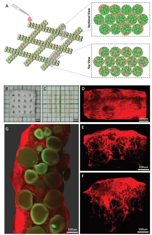 为打印HP-GNMS,PF-127被用作支撑和牺牲墨水,因为它具有优异的流变性能,可以在温和条件下轻松打印并随后去除(图3A)。值得注意的是,30%(w/v)的PF-127在22℃时表现出凝胶状态,弹性模量约为0.84 × 104 Pa,而在4℃以下转变为液态。这种相变简化了从3D打印的两相支架中去除牺牲墨水的过程。此外,在4℃下通过高速离心将微球掺入液体PF-127墨水中,结果形成密集排列的微球以用于3D打印(图3A)。密集排列的微球显著改善了生物墨水的流变特性。值得注意的是,在22℃的打印温度下,含有密集排列微球的生物墨水的弹性模量(2.5 × 104 Pa)明显高于纯PF-127(0.84 × 104 Pa)和在PF-127中均匀分散微球的生物墨水(1.7 × 104 Pa)。此外,在密集排列微球的条件下,由不同浓度GelMA(8%,12%,16%,20%和24%)制成的微球在22℃下的生物墨水弹性模量没有显著差异。这表明微球的GelMA浓度对密集排列微球生物墨水的流变特性和可打印性影响不大。