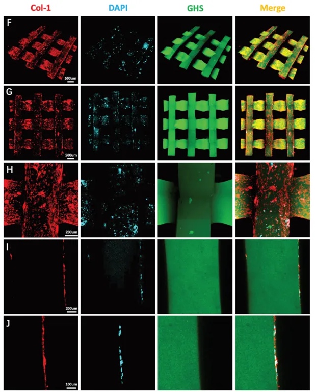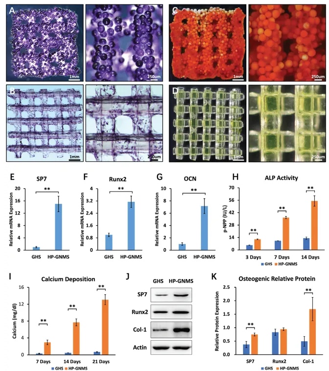 HP-GNMS组在成骨基因(包括SP7、Runt相关转录因子2 (Runx2) 和骨钙素(OCN))的表达水平上显著高于GHS组。在成骨(图5E–G)和非成骨分化条件下,均观察到这种上调。ALP染色显示,HP-GNMS组的ALP表达明显高于GHS组(图5A,B)。定量分析进一步表明,HP-GNMS在第3天、第7天和第14天的ALP活性分别是GHS的2.2倍、3.5倍和4.2倍(图5H)。茜素红染色显示,HP-GNMS上有均匀的矿物沉积,而GHS组只有少量的矿物沉积(图5C,D)。钙沉积的定量评估显示,HP-GNMS组在第7天、第14天和第21天的钙沉积量分别是GHS组的9.3倍、16.6倍和19.0倍(图5I)。Western blot显示,HP-GNMS组在14天的Col-1表达量是GHS组的3.4倍(图5J,K)。免疫荧光染色显示,HP-GNMS表面(图6A–C)、间隙内(图6D)以及纳米纤维微球内部(图6D,E)有均匀分布的胶原纤维。相比之下,GHS表面上只有少量的Col-1沉积(图6F–J)。这些结果表明,与GHS相比,HP-GNMS显著增强了成骨分化和ECM沉积。