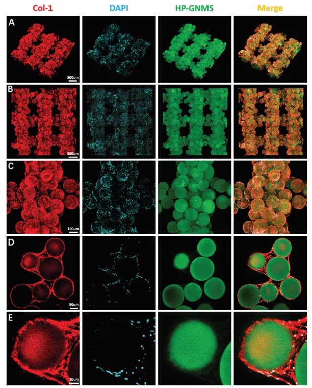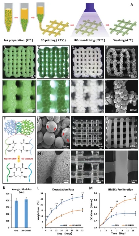【3D打印分层多孔GelMA纳米纤维微球支架(HP-GNMS)和GelMA水凝胶支架(GHS)】