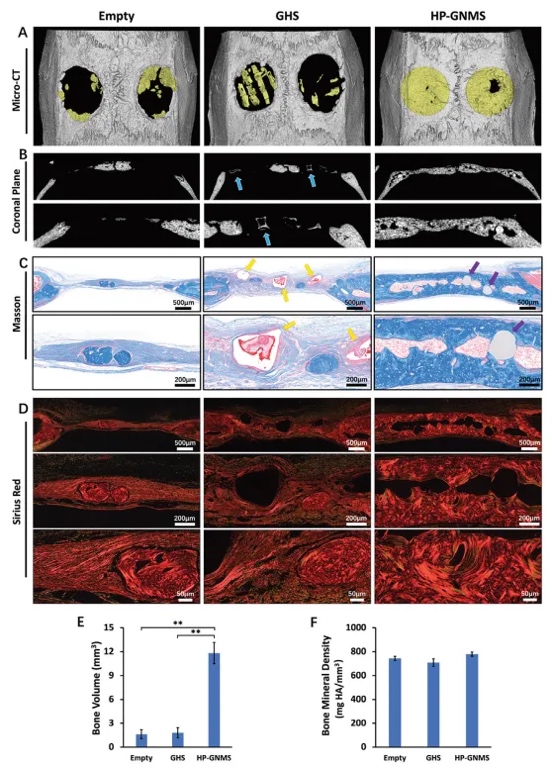 将BMSCs负载的支架在体外培养3天后植入缺损部位,可以深入了解HP-GNMS在等量外源性干细胞存在的情况下对骨生成再生的影响。这项研究策略还旨在探讨在模拟等量内源性干细胞丰度条件下,具有纳米纤维结构的分层多孔支架对骨生成再生的影响。Micro-CT分析显示,HP-GNMS组的新骨组织显著覆盖了缺损区域,与空对照组和GHS组相比,表现出显著优越的成骨能力(图7A, B)。HP-GNMS组新骨体积分别是Empty组和GHS组的7.3倍和6.6倍(图7E)。值得注意的是,在GHS组中,新形成的骨骼主要位于GHS的表面,导致GHS内部出现空洞(图7B,蓝色箭头)。尽管所有组的新骨密度相当(图7F),但天狼猩红染色显示,HP-GNMS组的新骨成熟度更高,表现为亮橙色且更密集排列的胶原纤维(图7D)。此外,牙本质基质蛋白1(DMP1)的表达在HP-GNMS组中显著升高,与Empty组和GHS组相比,DMP1在调控成骨细胞分化和成熟、骨细胞形成以及维持正常骨矿化方面至关重要,表明HP-GNMS组的骨形成和重塑得到增强。