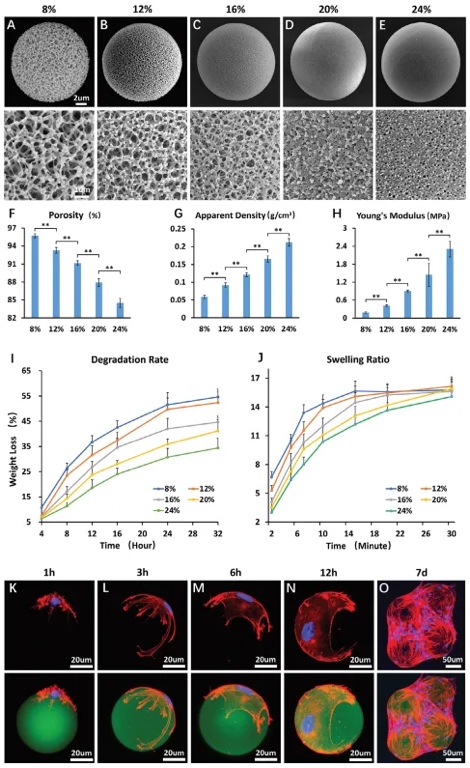 GMNF-MS的纳米结构和孔隙率通过改变GelMA浓度来调节。随着GelMA浓度的增加,观察到纳米纤维结构和多孔特性逐渐减弱(图2A–E)。当GelMA浓度从8%增加到16%时,纳米纤维的平均长度从776 ± 175 nm减小到296 ± 71 nm,同时纳米纤维的直径增加。值得注意的是,在20%的GelMA浓度下,纳米纤维变粗并聚集(图2D)。因此,当GelMA浓度从8%增加到24%时,GMNF-MS的孔隙率从96%降低到83%(图2F)。与此同时,GMNF-MS的表观密度和弹性模量分别增加了三倍和12.5倍(图2G,H)。此外,GMNF-MS的降解速率随着GelMA浓度的增加而降低(图2I)。较高的GelMA浓度导致GMNF-MS的孔隙率和比表面积减少,从而减少了明胶酶的攻击点并减缓了降解速度。不同浓度的GMNF-MS在30分钟内显示出相似的平衡溶胀比,约为15倍,表明GelMA浓度对溶胀平衡的影响最小(图2J)。鉴于使用12% GelMA制备的GMNS-MS具有优化的纳米纤维结构和物理性质,这些微球被选中用于后续实验。