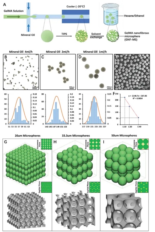 GMNF-MS通过结合微流控技术和热诱导相分离(TIPS)技术合成(图1A)。在制备过程中,GelMA溶液作为分散相,而矿物油作为连续相,以生成球形的GelMA滴液,随后通过TIPS技术处理形成GMNF-MS。这些GMNF-MS表现出狭窄的尺寸分布。通过调整连续相(GelMA溶液)和分散相(矿物油)之间的流速比,可以定制GMNS-MS的尺寸(图1B–F)。在本研究中,使用了直径为250 µm的微流控芯片,并且GelMA溶液的流速为0.1 mL h−1。当矿物油的流速从4降低到1 mL h−1时,GMNS-MS的直径分别为55–58 µm和221–223 µm(图1B–D)。GMNS-MS的直径符合线性方程Y = −2148.7X + 267.85,其中X是GelMA溶液/矿物油的流速比(图1F)。
