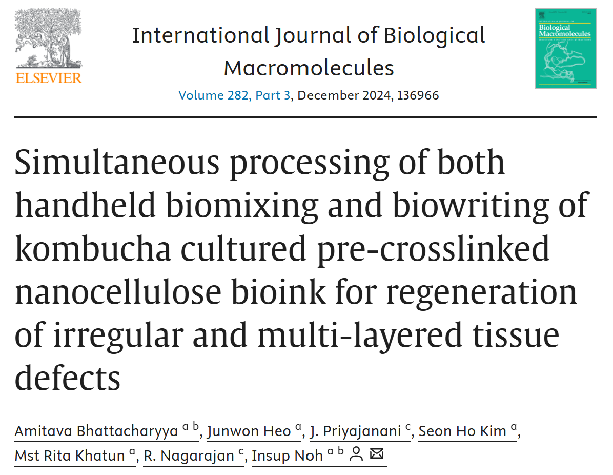 相关论文以题为“Simultaneous processing of bothhandheld biomixing and biowriting of kombucha cultured pre-crosslinkednanocellulose bioink for regeneration of irregular and multi-layered tissuedefects”的论文发表在《国际生物大分子杂志》上。