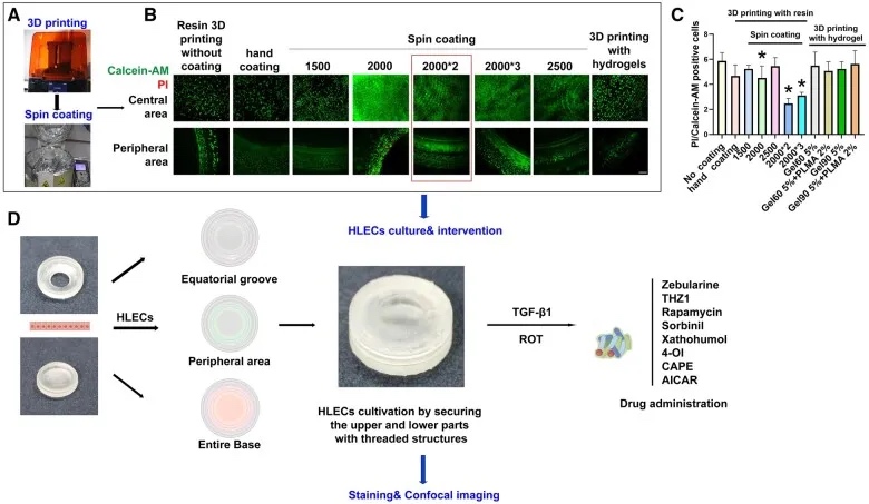 为确定最佳水凝胶混合物作为PCO模型的超薄涂层,研究人员通过评估不同浓度以及材料条件下细胞的可渗透性和生物相容性,选择了5wt% GelMA60和2wt% ε-PLMA作为最佳混合物。而后为了更好的复制透镜囊的晶状体结构并为人晶状体上皮细胞(HLEC)培养创造最佳条件,比较了用水凝胶涂覆PCO模型的各种方法,发现采用旋涂法且转速2000 rpm时得到的水凝胶涂层具有优异的生物相容性、稳定性、抗菌活性和低氧化应激发生率,为HLEC提供了有利生长环境。