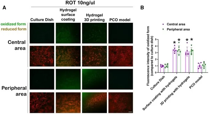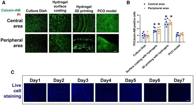 研究人员对比了培养皿培养、水凝胶3D打印培养、PCO模型构建三种方法下细胞的活性以及脂质过氧化水平,验证了用于PCO模型表面的水凝胶涂层的旋涂技术为HLEC培养提供了最佳环境,表明了所提出的PCO模型构建方式确保了机械支撑、形态稳定性和生物相容性特征之间的平衡。