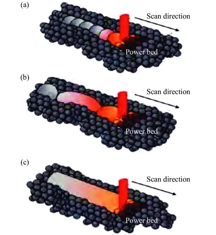 (1)激光功率:优化激光功率可以改变材料的熔池形态,图2所示为3种不同类型的熔池。可通过控制不同的熔池类型,从而控制微观组织的晶粒尺寸和分布。高激光功率可能导致熔池过度熔化,产生孔洞或微裂纹,而低激光功率则可能导致熔池不足,形成未熔缺陷。