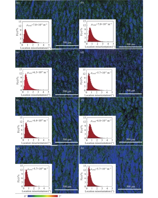 Song等研究了不同激光功率和扫描速度对孔隙率和核平均取向偏差(KAM)的影响。图4所示为激光粉末床熔融技术不同参数下的孔隙率,可以看出激光功率一定时,随着扫描速率的增加,孔隙率显著增加。当扫描速率一定时,激光功率的改变对孔隙率影响不大。激光功率和扫描速度对熔池稳定性与孔隙率的影响具有显著的非线性特征。在适当范围内,较高扫描速度有助于提高熔池的形状稳定性与冷却均匀性,从而减少孔隙率。KAM值可用于反映晶格失配的程度,靠近晶界的区域一般具有相对较高的KAM值,而晶粒内部区域的KAM值几乎为零,相邻晶粒之间的晶格失配可能导致严重的局部残余应变。KAM可用于估计激光粉末床熔融技术样品的位错密度,不同激光粉末床熔融工艺参数下的KAM值如图5所示,适当范围内的激光功率和扫描速度提升了激光粉末床熔融过程中熔池的稳定性,减少了孔隙率,提高了致密性。通过优化工艺参数使得Co47.5Fe28.5Ni19Si3.4Al1.6高熵合金的拉伸屈服强度提升至417.0 MPa,延伸率可达33.9%。同时形成了独特的位错–析出网络,增强了综合性能,包括优异的软磁性和力学性能。以上研究表明,适当的参数调节能显著改善微观结构的均匀性,从而提高力学性能和功能特性。因此,优化扫描速度需要考虑其非线性影响,并与激光功率等参数协同调控,以获得最佳致密性。