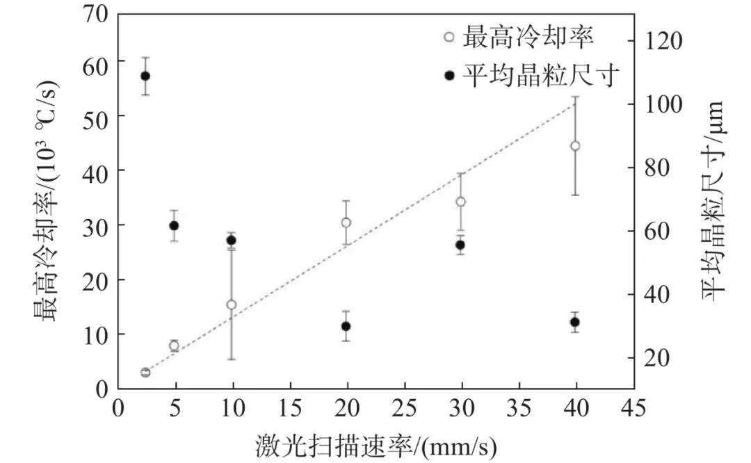 (2)扫描速度:扫描速度对冷却速率和凝固模式有直接影响。较高的扫描速度可能促进熔池快速凝固和细晶形成,但扫描速度过快会导致熔池不稳定。较低的扫描速度则可能增加热累积,形成粗晶或不均匀组织。Kunce等生产高熵合金AlCoCrFeNi的薄壁样品时发现激光扫描速度对合金的微观组织形态有显著影响。随着扫描速度的增加,冷却速率提高,晶粒尺寸减小。冷却速度和样品的平均尺寸随扫描速度变化关系如图3所示。扫描速度从2.5增加到40.0 mm/s时,平均晶粒尺寸从(108.3±32.4) μm减小到(30.6±9.2) μm。此外,扫描速度的变化还影响析出相的形态,在枝晶和枝晶间区域,析出物从细小球形(直径小于100 nm)转变为旋节状(厚度小于100 nm)。这些结果表明,通过调节激光扫描速度,可以控制AlCoCrFeNi高熵合金的微观组织,从而优化其性能。