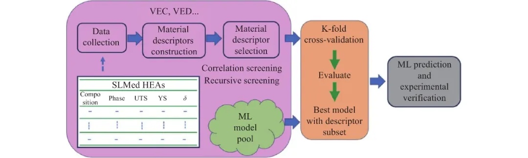 将新兴技术与制造工艺相结合是提升加工效果的重要途径。例如,通过协同优化激光功率、扫描速度和扫描策略,可以实现对复杂工艺参数的智能化控制。近年来,机器学习(ML)和人工智能技术的引入,为选择性激光熔化技术加工高熵合金的研究提供了新思路。Tan等采用机器学习技术可以预测通过选择性激光熔化技术制得的高熵合金的显微组织和力学性能,机器学习策略流程图如图9所示。通过优化材料描述符和机器学习模型,研究者们成功构建了一个模型,该模型在区分选择性激光熔化技术加工高熵合金的面心立方、体心立方和双相结构方面,准确率达到了81.58%。此外,还开发了预测拉伸性能的优化模型,对极限拉伸强度(UTS)和屈服强度(YS)预测的平均绝对百分比误差(MAPE)分别为20.43%和20.25%,具有较高的可靠性。实验表明,使用选择性激光熔化技术制造的多种高熵合金,实际性能与预测结果具有良好的一致性。未来研究也可以更加关注增材制造过程中的多物理场模拟,以精准预测熔池行为和微观组织演变。