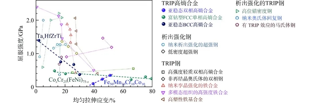 Ma等通过设计纳米结构和利用多组元效应,制备的高熵合金实现了超越传统金属和异质纳米结构金属的强度–延展性组合,其屈服强度和拉伸应变关系如图6所示。同时该研究通过调控增材制造过程中热处理参数,发现异质性结构对高熵合金的强度和塑性具有明显的协同作用。图7通过总结和对比不同微观结构高熵合金的性能,说明了异质性设计的关键作用。采用不同的冷却速率和热处理工艺,如深低温处理和多次热循环,成功制备了纳米级析出物和高密度晶界位错网络。结果表明这些优化方法能够显著提升材料的强度,同时保持良好的塑性。图8所示为相变诱导塑性(Transformation-induced plasticity,TRIP)效应和孪生诱导塑性(Twinning-induced plasticity,TWIP)效应对不同材料中屈服强度与均匀拉伸应变的影响,其中TRIP HEAs表现出优异的性能,说明通过相变和孪晶效应优化微观结构的重要性。该研究进一步证明,通过引入异质性可以有效缓解增材制造中常见的裂纹问题,并在材料的性能设计中提供更大的灵活性,热处理工艺和冷却速率的精确控制是优化高熵合金力学性能的关键。