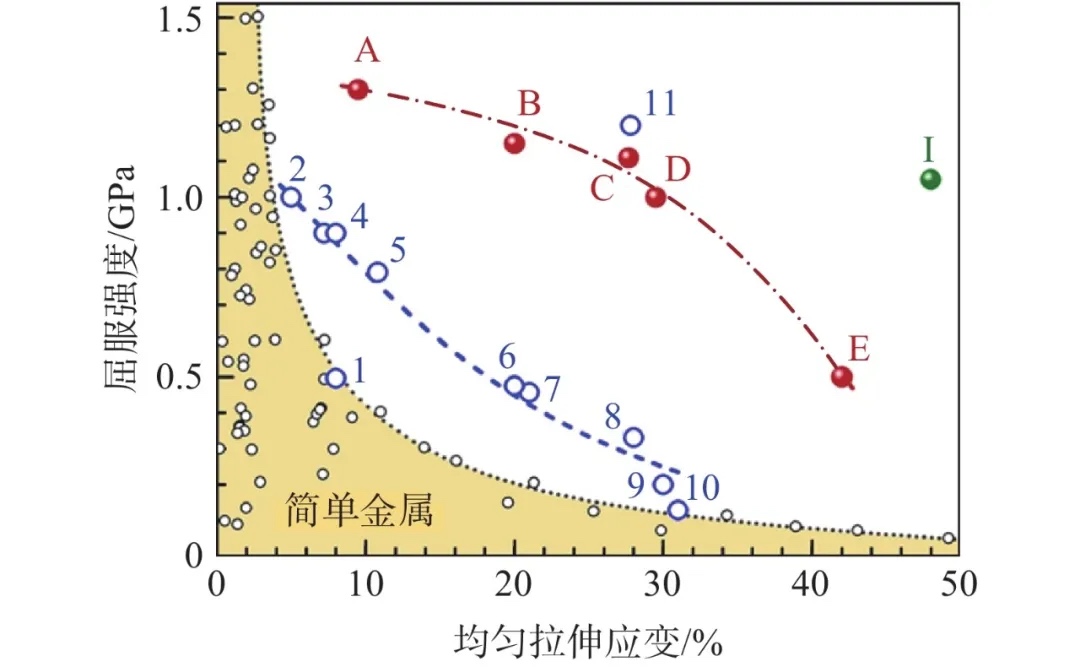 (2)高熵合金的塑性与韧性主要取决于其相结构,FCC相的滑移系较多,位错易于运动,延展性优异;BCC相由于滑移系较少且有较高的剪切模量,塑性较低。通过双相结构的设计(如FCC+BCC复合相),可有效改善强度–延展性平衡,FCC相的柔韧性与BCC相的硬度形成互补,使得材料在高强度下仍能保持较好的塑性。