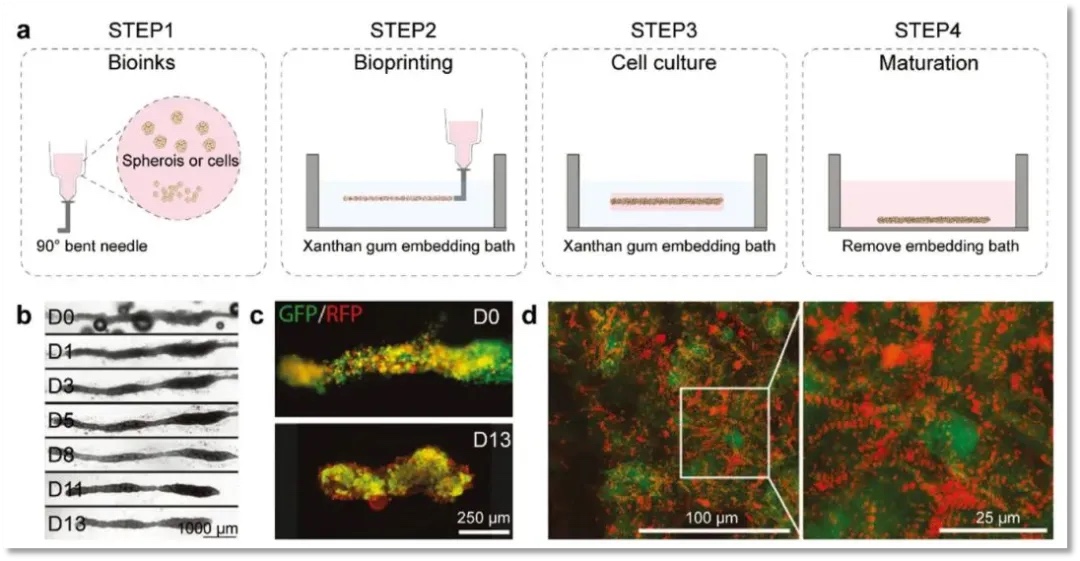 4)高细胞密度生物打印中形成基于纤维的细胞聚集体的过程:本研究通过优化生物墨水的配方及打印参数,达成了细胞的高密度排列,进而增强了细胞之间的相互作用。特别地,在包埋浴中加入水后,可以将黄原胶的粘度稀释至水的水平,这样在没有添加相应酶的情况下,便能够轻松提取出打印的结构。
