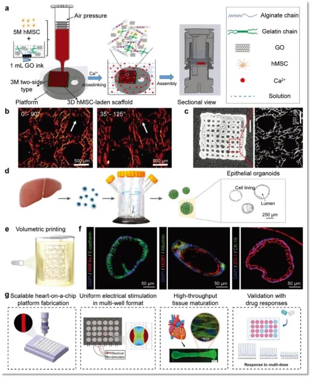 7)骨骼、肝脏及心脏类器官的三维生物打印应用实例:通过特定的打印策略与材料选择,实现了这些复杂器官的体外重建。利用三维生物打印技术和硅酸钙(CS)纳米线,提升了受神经支配的骨类器官的形状保真度,并同时促进了成骨与神经发生。借助计算机辅助设计(CAD)及自动化技术,三维打印技术为肝类器官提供了个性化药物测试、肝再生及肝脏疾病模型等病理生理学分析的显著优势。此外,该技术还为心脏类器官的构建提供了一种通用解决方案,包括几何结构、血管化及高效生产等方面。