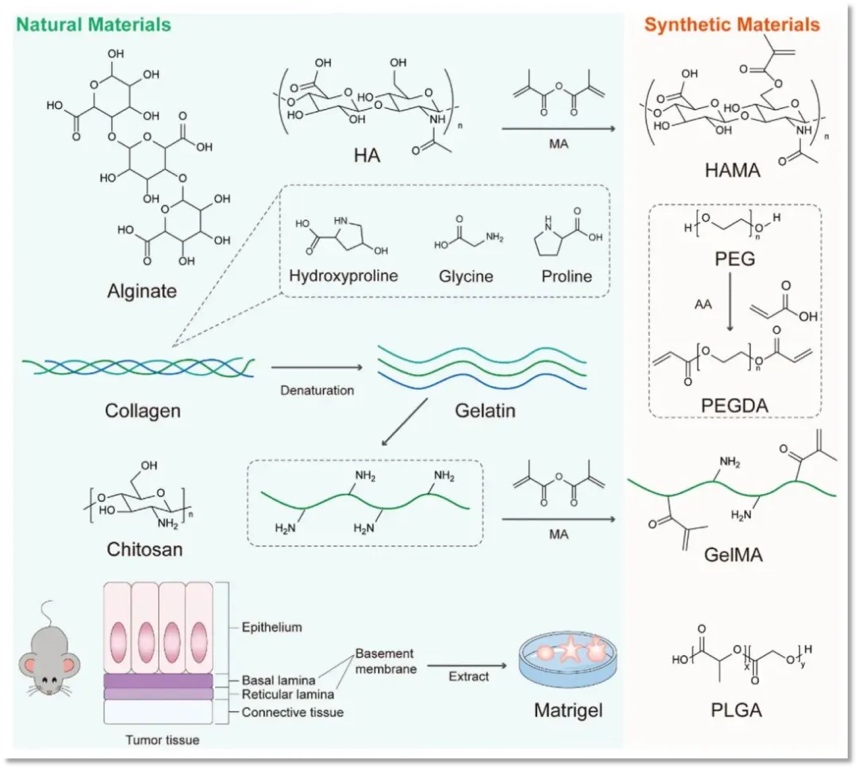 3)用于类器官生物打印的生物墨水:本研究探讨了多种常用的天然材料(例如海藻酸盐、透明质酸及胶原蛋白)与合成材料(如GelMA和PEGDA)的化学结构及其特性。这些材料的选择对成功构建类器官具有重要意义。