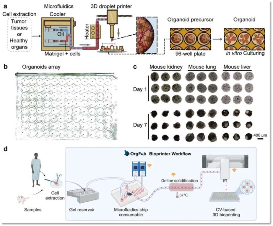 6) 自动化与高通量技术在类器官培养标准化中的应用:三维生物打印被认为是一种有潜力的方法,旨在提升类器官的重现性,同时加速标准化及药物筛选的周期。已有研究致力于开发自动化类器官平台,以解决器官培养中的效率和标准化问题。研究人员结合了微流控技术与三维打印,利用3D微流体液滴打印机将由细胞和基质凝胶组成的类器官前体打印至96孔板中,该平台能够在一周内生成超过400微米的类器官,展现出器官间的一致性与患者间的多样性。同样,三维打印技术与微流控技术的结合,使得在384孔板上实现高通量类器官打印成为可能,仅需使用5微升的生物墨水。